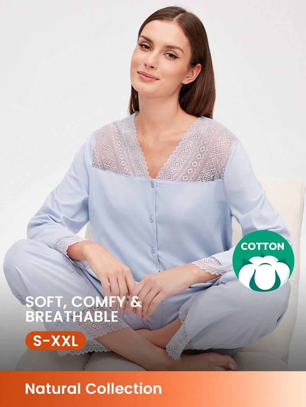 Conjunto de pijama de lencería de pantalón y blusa abotonada con elegante encaje de algodón 100% puro azul suave para mujer. Pantalones con bolsillos, conjunto de ropa de estar por casa para otoño, primavera y verano.