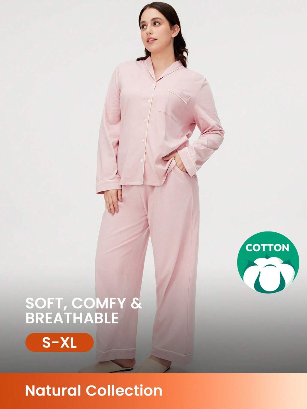 Ensemble de pyjama doux en 100% coton pur avec bordure contrastée, Top boutonné de base et pantalon rose. Ensemble de vêtements de détente avec poches. Idéal comme cadeau de la Saint-Valentin ou pour un mariage.