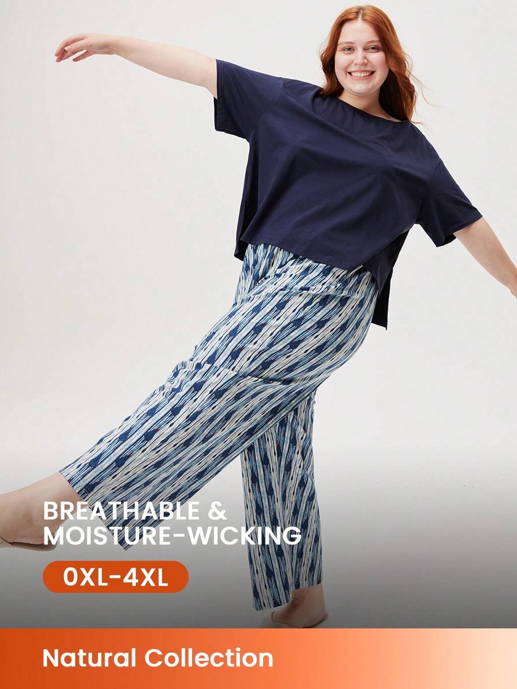 Ensemble de pyjama aéré pour femmes composé d'un t-shirt long basique doux orange et d'un pantalon en coton à motifs. Pantalon avec poches. Lingerie pouvant être portée comme vêtement d'extérieur.
