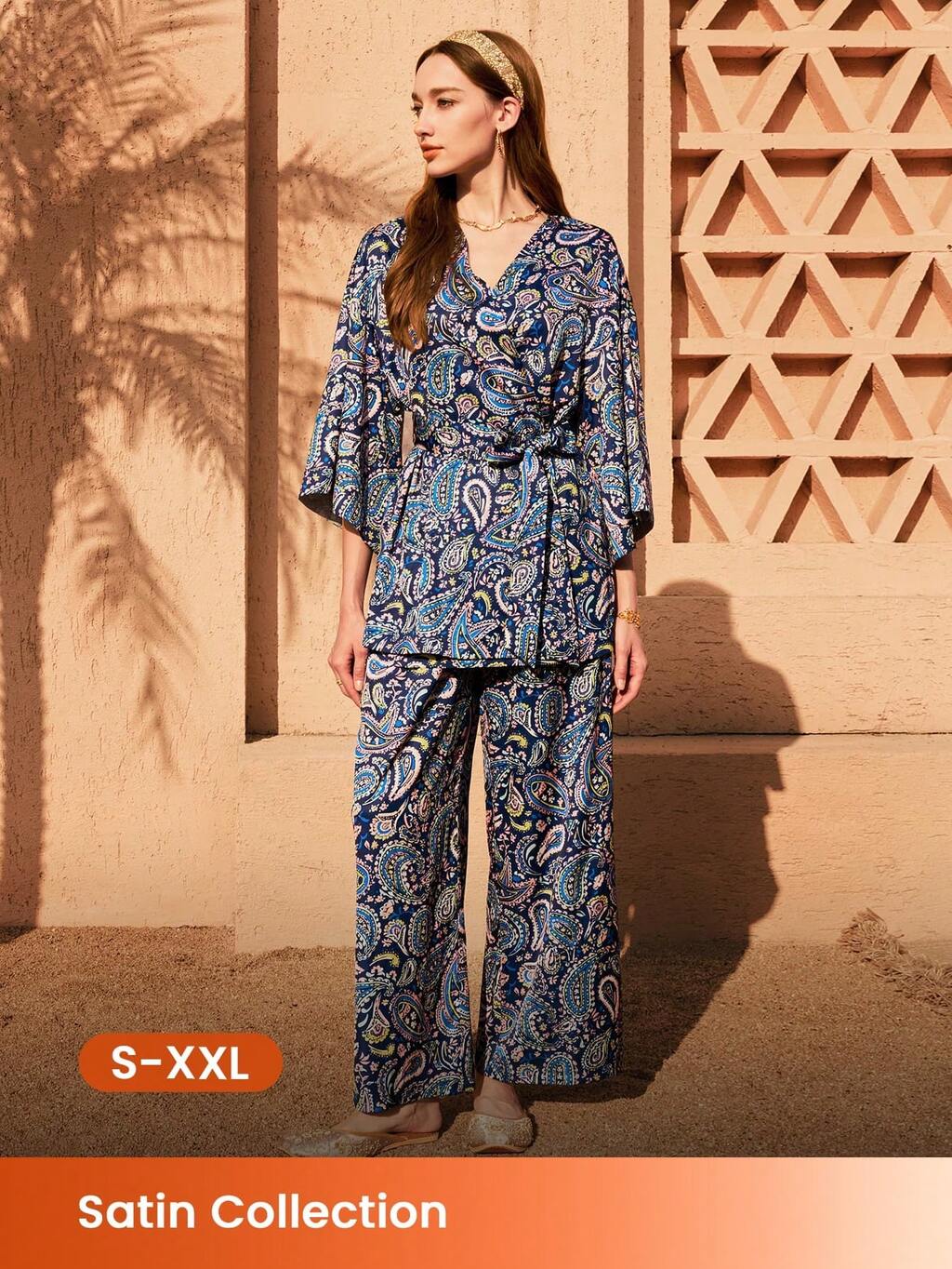 レディース オールシーズン ペイズリー柄パジャマ - ルーズフィット サテンキモノセット ウエストリボン付き 春夏秋冬快適