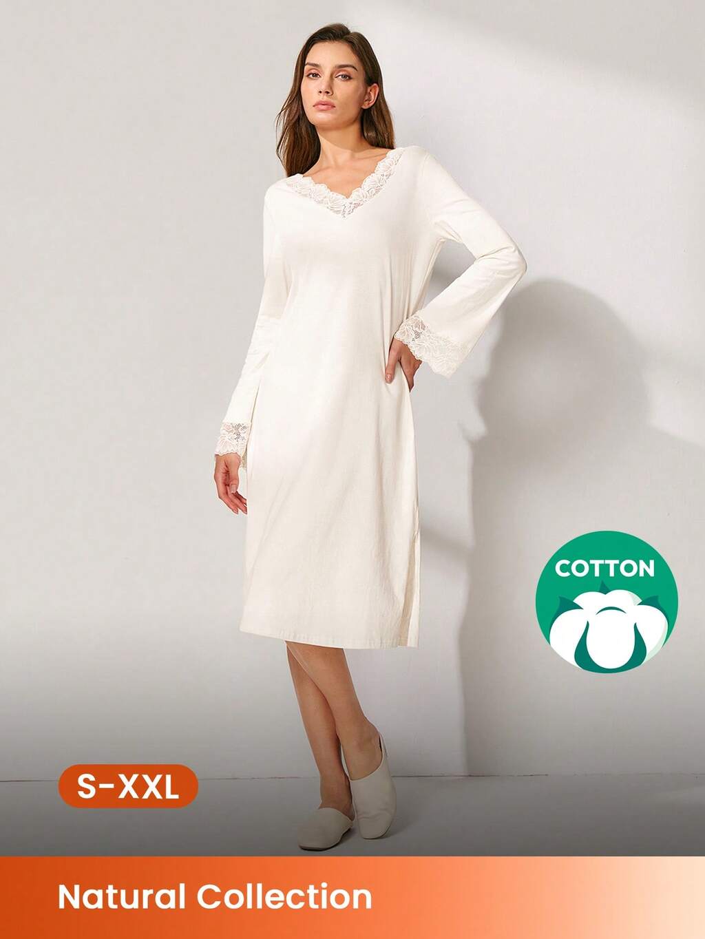 Camisola Longa de Algodão Puro 100% Azul Marinho Macio com Decote em V, Detalhe em Renda Elegante, Manga Longa, Vestido Camisola, Lingerie e Pijama, Vestidos de Pijama de Algodão para Mulheres